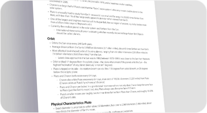 NEW HORIZONS Pluto at a Glance General • First planet discovered by an American, Lowell Observatory astronomer Clyde Tombaugh in 1930. • It is the only planet in the solar system never visited by a spacecraft. • Pluto has three known moons – Charon, discovered in 1978, and at least two smaller satellites, discovered in 2005. • Charon is so large (half of Pluto’s size) that the Pluto-Charon system is the only known double planet in the solar system. • Pluto is unusually hard to study from Earth because it is so small and far away. It is 50,000 times fainter than Mars, with less than 1% of the red planet’s apparent diameter when viewed from Earth. • One of the largest and brightest members of the Kuiper Belt, the vast region of ancient, icy, rocky bodies more than a billion miles beyond Neptune’s orbit. • Currently the smallest planet in the solar system and farthest from the Sun. - International Astronomical Union is debating whether recently discovered large Kuiper Belt Objects should be called planets. Orbit • Orbits the Sun once every 248 Earth years. • Average distance from the Sun is 5.9 billion kilometers (3.7 billion miles), about 40 times farther out than Earth. • Most elliptical (oval-shaped) orbit of the nine planets, ranging from 4.4 billion kilometers (2.8 billion miles) to 7.4 billion kilometers (4.6 billion miles) from the Sun. - Latest close approach to the Sun was in 1989; between 1979-1999 it was closer to the Sun than Neptune. • Orbit is tilted 17 degrees from the ecliptic plane – the plane where most of the planets orbit the Sun – the highest “inclination” of any planet (Mercury is next at 7 degrees). • Pluto is tipped on its side – its rotational north pole is tilted 118 degrees from celestial north, or 28 degrees below the ecliptic plane. • Pluto and Charon both rotate every 6.4 days. - Charon also orbits Pluto once every 6.4 days, at an orbit of 19,636 kilometers (12,201 miles) from Pluto (Charon orbits at Pluto’s “synchronous” distance). - Pluto and Charon are locked in a gravitational resonance where not only does Charon keep the same face to Pluto (just like Earth’s moon) but, also, Pluto always sees the same face of Charon. - Pluto’s smaller moons are roughly two to three times farther from Pluto than Charon, and roughly 10-20% of Charon’s size. Physical Characteristics: Pluto • Exact diameter is uncertain to within about 50 kilometers, but close to 2,360 kilometers (1,466 miles); about two-thirds the diameter of Earth’s moon. • Surface composition includes nitrogen, carbon monoxide, methane and water ices. - Many other materials may also be present but undiscovered. • Has a tenuous but complex atmosphere made mostly of nitrogen, with traces of methane, carbon monoxide, and some heavier hydrocarbons. The upper atmosphere has a significant amount of free hydrogen. - The atmosphere undergoes extreme seasonal changes as Pluto orbits the Sun. • Atmospheric surface pressure is currently about 100,000 times less than on Earth, about 600 times less than on Mars. 6 NASA’s First Mission to Pluto and the Kuiper Belt