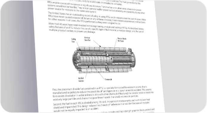 NEW HORIZONS New Horizons Nuclear Safety The New Horizons spacecraft derives its electrical power from a radioisotope thermoelectric generator (RTG), a lightweight, compact spacecraft power system that is extraordinarily reliable. An RTG has no moving parts, and uses neither fission nor fusion processes to produce energy. Instead, it provides power through the natural radioactive decay of plutonium (mostly Pu-238, a non-weapons-grade isotope). The heat generated by this natural process is changed into electricity by a solid-state thermoelectric converter. RTGs enable spacecraft to operate at significant distances from the Sun or in other areas where solar power systems would not be feasible. They remain unmatched for power output, reliability and durability by any other power source for missions to the outer solar system. The United States has an outstanding record of safety in using RTGs on 24 missions over the past 40 years. While RTGs have never caused a spacecraft failure on any of these missions, three missions experienced malfunctions for other reasons. In all cases, the RTGs performed as they were designed to do. More than 40 years have been invested in the engineering, analysis and testing of RTGs. As described below, safety features of an RTG include the use of a specific type of fuel material, a modular design, and the use of multiple physical barriers to prevent any leakage. �������� ����������������� ������� ����������� ����������� ����� ���������� ������������ ���������� First, the plutonium dioxide fuel contained in an RTG is a specially formulated fire-resistant ceramic that is manufactured as pellets to reduce the possibility of fuel dispersion in a launch or reentry accident. This ceramic form resists dissolution in water and reacts little with other chemicals. If fractured, the ceramic tends to break into relatively large particles and chunks that pose fewer hazards than small, microscopic particles. Second, the fuel in each RTG is divided among 18 small, independent modular units, each with its own heat shield and impact shell. This design reduces the chances of fuel release in an accident because all modules would not be equally impacted in an accident. Multiple layers of protective materials, including iridium capsules and high-strength graphite blocks, protect and contain the fuel and reduce the chance of release of the plutonium dioxide. Iridium, a strong, ductile, corrosion- resistant metal with a very high melting temperature, encases each fuel pellet. Impact shells made of lightweight and highly heat-resistant graphite provide additional protection. NASA’s First Mission to Pluto and the Kuiper Belt 35