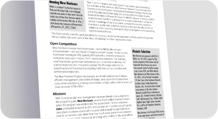 NEW HORIZONS NASA’s New Frontiers Program With the New Frontiers Program, NASA aims to explore the solar system with frequent, medium-class, scientifically focused spacecraft missions. NASA established the program in 2003 while building on the innovative approaches used in its Discovery and Explorer programs – providing a way to identify and select missions too challenging within Discovery’s cost and time constraints. New Frontiers missions will tackle specific exploration goals identified as Naming New Horizons top priorities in the landmark 2002 National Research Council study, New What’s in a name? For the first mission to Frontiers in the Solar System: An Integrated Exploration Strategy. Also known Pluto and the Kuiper Belt, a lot of thought, as the “Decadal Survey,” the study was conducted by the Space Studies creativity and weeks of hard work! Read the Board of the National Research Council at NASA’s request. In doing so, NASA inside story of how New Horizons earned its sought to examine the big picture of solar system exploration, survey the moniker on the mission Web site, at http:// current knowledge of our solar system, compile the scientific questions pluto.jhuapl.edu/overview/piPerspectives/ that should guide solar system exploration in the next decade, and list (in piPerspective_05_2005_1.html. order) the most promising avenues for flight investigations and supporting ground-based activities. The high-priority scientific goals identified by the study related to the exploration of Pluto and the Kuiper Belt, Venus, Jupiter, the south pole of the Moon (including the Aitken Basin) and comets. Open Competition New Frontiers missions start as proposals – sent to NASA after an open Historic Selection announcement – and are chosen through a competitive peer review process. A principal investigator (PI), typically affiliated with a university or research New Horizons was proposed to AO-OSS-01, institution, leads each mission. The PI selects team members from industry, NASA’s Jan. 20, 2001, request for flyby small businesses, government laboratories and universities to develop the mission proposals to Pluto-Charon and the science objectives and instrument payload. The PI is responsible for the Kuiper Belt. New Horizons was one of overall success of the project by assuring it will meet all cost, schedule and two proposals chosen for further concept performance objectives. study in June 2001, and NASA selected The New Frontiers Program encourages use of validated new technologies, New Horizons as its Pluto mission on Nov. efficient management, and control of design, development and operations 29, 2001. Led by Principal Investigator costs while maintaining a strong commitment to flight safety. Total mission cost (PI) Alan Stern of the Southwest Research must be under $700 million. Institute’s Space Studies Department, Boulder, Colo., the mission team included Missions major partners at the Johns Hopkins University Applied Physics Laboratory in With its mission plan and management structure already closely aligned to Laurel, Md.; Stanford University, Palo Alto, the program’s goals, New Horizons became the first New Frontiers mission Calif.; Ball Aerospace Corp., Boulder; NASA when the program was established. The second New Frontiers mission is Goddard Space Flight Center, Greenbelt, Juno, scheduled to launch in 2011 and conduct an in-depth study of Jupiter. Md.; and the Jet Propulsion Laboratory, Juno plans to place a spacecraft in a polar orbit around the giant planet to Pasadena, Calif. look for an ice-rock core, determine how much water and ammonia exists in New Horizons is the first-ever PI-led mission the atmosphere, study convection and deep wind profiles in the atmosphere, to the outer planets and the first mission of examine the origin of the Jovian magnetic field, and explore the polar the New Frontiers Program. magnetosphere. NASA’s Discovery and New Frontiers Program Office at Marshall Space Flight Center in Huntsville, Ala., assists the Science Mission Directorate at NASA Headquarters with program management, technology planning, systems assessment, flight assurance and public outreach. The Marshall Center assures the availability of the technical expertise to quickly assess needs and manage the support structure to provide oversight to these missions. For more information on the New Frontiers Program, visit http://newfrontiers.nasa.gov NASA’s First Mission to Pluto and the Kuiper Belt 15