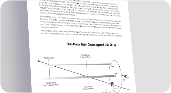 NEW HORIZONS surface. New Horizons will also sample material coming from Pluto’s atmosphere, and it will image all of Pluto’s moons during this period. During the half-hour when the spacecraft is closest to Pluto and Charon, it will take close-up pictures in both visible and near-infrared wavelengths. The best pictures of Pluto will depict surface features as small as 25 meters (about 80 feet) across. Even after the spacecraft passes Pluto, Charon and their two smaller companion moons, its work is far from done. Looking back at the mostly dark side of Pluto or Charon is the best way to spot haze in the atmosphere, to look for rings, and to determine whether their upper surfaces are smooth or rough. Also, the spacecraft will fly through the shadows cast by Pluto and Charon and observe both the Earth and Sun setting, and then rising, through Pluto’s atmosphere. It will look back at the Sun and Earth, and watch the light from the Sun and pick up radio waves from transmitters on Earth. These measurements will reveal the composition, structure, and thermal profile of Pluto’s atmosphere in exquisite detail. Many of these types of measurements were made by spacecraft like the Voyagers and the Mariners on previous first flybys of planets. However, New Horizons also brings some revolutionary new capabilities to bear. These include temperature and composition mapping capabilities and a dust detector to pick up tiny debris particles near Pluto. The technology for these latter kinds of instruments was not available when the Mariner and Voyager spacecraft were flown. New Horizons will approach Pluto from the planet’s southern hemisphere – for a July 2015 encounter, the southern hemisphere will be sunlit and the northern cap dark. The spacecraft flies toward Pluto at a solar phase ������������������������������������������������ ���������������������� ����������������������� �������������������������� ������ ����� ��� ������� ��������������������� ����� ����������������������������������� �������������������� �������������������������� ����������������������� �������������������������������������������������������� �������������������������������������������������� ������������������������������������������������ ��������������������������������� ������������������������������������������������� �������������������������� ������������������������������������������������������ ����������������������������������������������������������� ������������������������������� ���������������������� ������������������������������������������������� ��������������������������������� NASA’s First Mission to Pluto and the Kuiper Belt 31