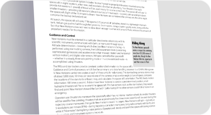 NEW HORIZONS The thermal blanketing – 18 layers of Dacron mesh cloth sandwiched between aluminized Mylar and Kapton film – also helps to protect the craft from micrometeorites. Propulsion The propulsion system on New Horizons is used for course corrections and for pointing the spacecraft. It is not needed to speed the spacecraft to Pluto; that is done entirely by the launch vehicle. The New Horizons propulsion system includes 16 small hydrazine-propellant thrusters mounted across the spacecraft in eight locations, a fuel tank, and associated distribution plumbing. Four thrusters that each provide 4.4 newtons (1 pound) of thrust will be used mostly for course corrections. The spacecraft will use 12 smaller thrusters – providing 0.8 newtons (about 3 ounces) of thrust each – to point, spin up and spin down the spacecraft. Eight of the 16 thrusters aboard New Horizons are considered the primary set; the other eight comprise the backup (redundant) set. At launch, the spacecraft will carry 77 kilograms (170 pounds) of hydrazine, stored in a lightweight titanium tank. Helium gas pushes fuel through the system to the thrusters. Using a Jupiter gravity assist, along with the fact that New Horizons does not need to slow down enough to enter orbit around Pluto, reduces the amount of propellant needed for the mission. Guidance and Control New Horizons must be oriented in a particular direction to collect data with its Riding Along scientific instruments, communicate with Earth, or maneuver through space. Attitude determination – knowing which direction New Horizons is facing – is The New Horizons spacecraft performed using star-tracking cameras, Inertial Measurement Units (containing carries a compact disc containing sophisticated gyroscopes and accelerometers that measure rotation and horizontal/ more than 435,000 names of vertical motion), and digital solar sensors. Attitude control for the spacecraft people who, through the New – whether in a steady, three-axis pointing mode or in a spin-stabilized mode – is Horizons Web site, signed up to accomplished using thrusters. send their names to Pluto! The IMUs and star trackers provide constant positional information to the spacecraft’s Guidance and Control processor, which like the command and data handling processor is a 12-MHz Mongoose V. New Horizons carries two copies at each of these units for redundancy. The star-tracking cameras store a map of about 3,000 stars; 10 times per second one of the cameras snaps a wide-angle picture of space, compares the locations of the stars to its onboard map, and calculates the spacecraft’s orientation. The IMU feeds motion information 100 times a second. If data shows New Horizons is outside a predetermined position, small hydrazine thrusters will fire to re-orient the spacecraft. The Sun sensors back up the star trackers; they would find and point New Horizons toward the Sun (with Earth nearby) if the other sensors couldn’t find home in an emergency. Operators use thrusters to maneuver the spacecraft, which has no internal reaction wheels. Its smaller thrusters will be used for fine pointing; thrusters that are approximately five times more powerful will be used during the trajectory course maneuvers that guide New Horizons toward its targets. New Horizons will spin – typically at 5 revolutions per minute (RPM)– during trajectory-correction maneuvers, long radio contacts with Earth, and while it “hibernates” during long cruise periods. Operators will steady and point the spacecraft during science observations and instrument-system checkouts. Communications New Horizons’ X-band communications system is the spacecraft’s link to Earth, returning science data, exchanging commands and status information, and allowing for precise radiometric tracking through NASA’s Deep Space Network of antenna stations. The system includes two broad-beam, low-gain antennas on opposite sides of the spacecraft for near-Earth communications: a 30-centimeter (12-inch) diameter medium-gain dish antenna and a large, 2.1-meter NASA’s First Mission to Pluto and the Kuiper Belt 23