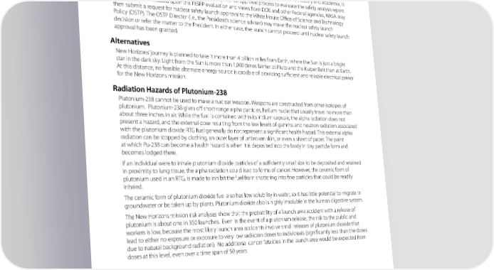NEW HORIZONS Risk Assessment and Launch Approval Any mission that plans to use an RTG as a power source undergoes a safety analysis carried out by the Department of Energy (DOE). The safety analysis report provides a comprehensive assessment of the potential consequences of a broad range of possible launch accidents. In addition to the DOE review, an Interagency Nuclear Safety Review Panel (INSRP), which is supported by experts from government, industry and academia, is established as part of a Presidential nuclear safety launch approval process to evaluate the safety analysis report prepared by DOE. Based upon the INSRP evaluation and views from DOE and other Federal agencies, NASA may then submit a request for nuclear safety launch approval to the White House Office of Science and Technology Policy (OSTP). The OSTP Director (i.e., the President’s science adviser) may make the nuclear safety launch decision or refer the matter to the President. In either case, the launch cannot proceed until nuclear safety launch approval has been granted. Alternatives New Horizons’ journey is planned to take it more than 4 billion miles from Earth, where the Sun is just a bright star in the dark sky. Light from the Sun is more than 1,000 times fainter at Pluto and the Kuiper Belt than at Earth. At this distance, no feasible alternate energy source is capable of providing sufficient and reliable electrical power for the New Horizons mission. Radiation Hazards of Plutonium-238 Plutonium-238 cannot be used to make a nuclear weapon. Weapons are constructed from other isotopes of plutonium. Plutonium-238 gives off short-range alpha particles, helium nuclei that usually travel no more than about three inches in air. While the fuel is contained within its iridium capsule, the alpha radiation does not present a hazard, and the external dose resulting from the low levels of gamma and neutron radiation associated with the plutonium dioxide RTG fuel generally do not represent a significant health hazard. This external alpha radiation can be stopped by clothing, an outer layer of unbroken skin, or even a sheet of paper. The point at which Pu-238 can become a health hazard is when it is deposited into the body in tiny particle form and becomes lodged there. If an individual were to inhale plutonium dioxide particles of a sufficiently small size to be deposited and retained in proximity to lung tissue, the alpha radiation could lead to forms of cancer. However, the ceramic form of plutonium used in an RTG, is made to inhibit the fuel from shattering into fine particles that could be readily inhaled. The ceramic form of plutonium dioxide fuel also has low solubility in water, so it has little potential to migrate in groundwater or be taken up by plants. Plutonium dioxide also is highly insoluble in the human digestive system. The New Horizons mission risk analyses show that the probability of a launch area accident with a release of plutonium is about one in 350 launches. Even in the event of a plutonium release, the risk to the public and workers is low, because the most likely launch area accidents involve small releases of plutonium dioxide that lead to either no exposure or exposure to very low radiation doses to individuals (significantly less than the doses due to natural background radiation). No additional cancer fatalities in the launch area would be expected from doses at this level, even over a time span of 50 years. 36 NASA’s First Mission to Pluto and the Kuiper Belt