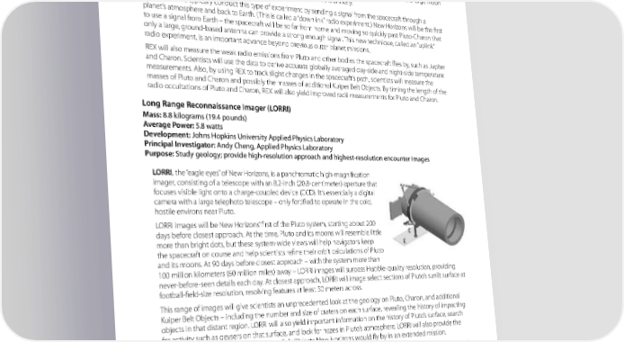 NEW HORIZONS REX will use an occultation technique to probe Pluto’s atmosphere and to search for an atmosphere around Charon. After New Horizons flies by Pluto, its 2.1-meter (83-inch) dish antenna will point back at Earth. On Earth, powerful transmitters in NASA’s largest Deep Space Network antennas will beam radio signals to the spacecraft as it passes behind Pluto. The radio waves will bend according to the average molecular weight of gas in the atmosphere and the atmospheric temperature. The same phenomenon could happen at Charon if the large moon has a substantial atmosphere, but Earth-based studies indicate this is unlikely. Space missions typically conduct this type of experiment by sending a signal from the spacecraft through a planet’s atmosphere and back to Earth. (This is called a “downlink” radio experiment.) New Horizons will be the first to use a signal from Earth – the spacecraft will be so far from home and moving so quickly past Pluto-Charon that only a large, ground-based antenna can provide a strong enough signal. This new technique, called an “uplink” radio experiment, is an important advance beyond previous outer planet missions. REX will also measure the weak radio emissions from Pluto and other bodies the spacecraft flies by, such as Jupiter and Charon. Scientists will use the data to derive accurate globally averaged day-side and night-side temperature measurements. Also, by using REX to track slight changes in the spacecraft’s path, scientists will measure the masses of Pluto and Charon and possibly the masses of additional Kuiper Belt Objects. By timing the length of the radio occultations of Pluto and Charon, REX will also yield improved radii measurements for Pluto and Charon. Long Range Reconnaissance Imager (LORRI) Mass: 8.8 kilograms (19.4 pounds) Average Power: 5.8 watts Development: Johns Hopkins University Applied Physics Laboratory Principal Investigator: Andy Cheng, Applied Physics Laboratory Purpose: Study geology; provide high-resolution approach and highest-resolution encounter images LORRI, the “eagle eyes” of New Horizons, is a panchromatic high-magnification imager, consisting of a telescope with an 8.2-inch (20.8-centimeter) aperture that focuses visible light onto a charge-coupled device (CCD). It’s essentially a digital camera with a large telephoto telescope – only fortified to operate in the cold, hostile environs near Pluto. LORRI images will be New Horizons’ first of the Pluto system, starting about 200 days before closest approach. At the time, Pluto and its moons will resemble little more than bright dots, but these system-wide views will help navigators keep the spacecraft on course and help scientists refine their orbit calculations of Pluto and its moons. At 90 days before closest approach – with the system more than 100 million kilometers (60 million miles) away – LORRI images will surpass Hubble-quality resolution, providing never-before-seen details each day. At closest approach, LORRI will image select sections of Pluto’s sunlit surface at football-field-size resolution, resolving features at least 50 meters across. This range of images will give scientists an unprecedented look at the geology on Pluto, Charon, and additional Kuiper Belt Objects – including the number and size of craters on each surface, revealing the history of impacting objects in that distant region. LORRI will also yield important information on the history of Pluto’s surface, search for activity such as geysers on that surface, and look for hazes in Pluto’s atmosphere. LORRI will also provide the highest resolution images of any Kuiper Belt Objects New Horizons would fly by in an extended mission. LORRI has no color filters or moving parts – operators will take images by pointing the LORRI side of the spacecraft directly at their target. The instrument’s innovative silicon carbide construction will keep its mirrors focused through the extreme temperature dips New Horizons will experience on the way to and past Pluto-Charon. NASA’s First Mission to Pluto and the Kuiper Belt 19
