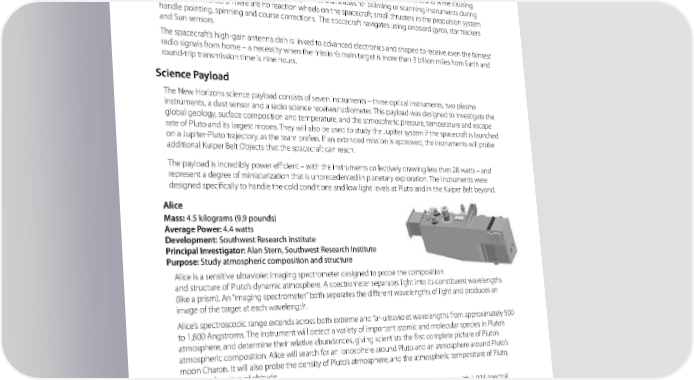 NEW HORIZONS The spacecraft’s “thermos bottle” design retains heat and keeps the spacecraft operating at room temperature without large, excess heaters. Aside from protective covers on five instruments, New Horizons has no deployable mechanisms or scanning platforms. It does have backup devices for all major electronics, its star-tracking navigation cameras and data recorders. New Horizons will operate in a spin-stabilized mode after launch, during early operations and while cruising between planets, and in a three-axis “pointing” mode that allows for pointing or scanning instruments during planetary encounters. There are no reaction wheels on the spacecraft; small thrusters in the propulsion system handle pointing, spinning and course corrections. The spacecraft navigates using onboard gyros, star trackers and Sun sensors. The spacecraft’s high-gain antenna dish is linked to advanced electronics and shaped to receive even the faintest radio signals from home – a necessity when the mission’s main target is more than 3 billion miles from Earth and round-trip transmission time is nine hours. Science Payload The New Horizons science payload consists of seven instruments – three optical instruments, two plasma instruments, a dust sensor and a radio science receiver/radiometer. This payload was designed to investigate the global geology, surface composition and temperature, and the atmospheric pressure, temperature and escape rate of Pluto and its largest moons. They will also be used to study the Jupiter system if the spacecraft is launched on a Jupiter-Pluto trajectory, as the team prefers. If an extended mission is approved, the instruments will probe additional Kuiper Belt Objects that the spacecraft can reach. The payload is incredibly power efficient – with the instruments collectively drawing less than 28 watts – and represent a degree of miniaturization that is unprecedented in planetary exploration. The instruments were designed specifically to handle the cold conditions and low light levels at Pluto and in the Kuiper Belt beyond. Alice Mass: 4.5 kilograms (9.9 pounds) Average Power: 4.4 watts Development: Southwest Research Institute Principal Investigator: Alan Stern, Southwest Research Institute Purpose: Study atmospheric composition and structure Alice is a sensitive ultraviolet imaging spectrometer designed to probe the composition and structure of Pluto’s dynamic atmosphere. A spectrometer separates light into its constituent wavelengths (like a prism). An “imaging spectrometer” both separates the different wavelengths of light and produces an image of the target at each wavelength. Alice’s spectroscopic range extends across both extreme and far-ultraviolet wavelengths from approximately 500 to 1,800 Angstroms. The instrument will detect a variety of important atomic and molecular species in Pluto’s atmosphere, and determine their relative abundances, giving scientists the first complete picture of Pluto’s atmospheric composition. Alice will search for an ionosphere around Pluto and an atmosphere around Pluto’s moon Charon. It will also probe the density of Pluto’s atmosphere, and the atmospheric temperature of Pluto, both as a function of altitude. Alice consists of a compact telescope, a spectrograph, and a sensitive electronic detector with 1,024 spectral channels at each of 32 separate spatial locations in its long, rectangular field of view. Alice has two modes of operation: an “airglow” mode that measures ultraviolet emissions from atmospheric constituents, and an “occultation” mode, where it views the Sun or a bright star through an atmosphere and detects atmospheric constituents by the amount of sunlight they absorb. Absorption of sunlight by Pluto’s atmosphere will show up as characteristic “dips” and “edges” in the ultraviolet part of the spectrum of light that Alice measures. This technique is a powerful method for measuring even traces of atmospheric gas. NASA’s First Mission to Pluto and the Kuiper Belt 17