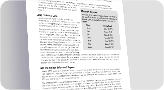 NEW HORIZONS angle of 15 degrees – excellent lighting conditions for remote sensing. In July 2015, Pluto will be more than 4.9 billion kilometers (3 billion miles) from Earth – about 32 times the distance between the Sun and Earth. The one-way light time delay – the time for a radio signal to reach New Horizons from Earth – at that distance is 4 hours and 25 minutes. Timing has to be precise: the team must transmit the signals used for probing the atmosphere with the Radio Science Experiment (REX) 4 hours and 25 minutes before the anticipated Earth occultation time. The entire encounter sequence will be intricately choreographed and precisely pre-programmed in New Horizons’ redundant flight computers. In fact, mission operators will not have continuous contact with New Horizons during the flyby, since the spacecraft will be turning various ways to collect data on Pluto and its Planetary Pioneers moons. New Horizons will join an elite class of spacecraft when it passes through the Long Distance Data Pluto system for the first time. The United States has led the reconnaissance A major mission challenge is the relatively low of the solar system, providing the first close-up look at every planet with a downlink rate at which New Horizons can transmit data spacecraft. to Earth – owing primarily to the long distance over Planet Mission (year) which the spacecraft has to send (or receive) a signal. Mercury Mariner 10 (1973) During the Jupiter flyby in February-March 2007, New Venus Mariner 2 (1962) Horizons will send data home at about 38 kilobits per Mars Mariner 4 (1965) second (kbps), just a little slower than the transmission Jupiter Pioneer 10 (1973) speed for most computer modems. The situation becomes much more challenging at Pluto, where the Saturn Pioneer 11 (1979) downlink rate will range between 600 to 1,200 bits per Uranus Voyager 2 (1985) second. At that rate mission operators would need several hours to downlink even a single image from Neptune Voyager 2 (1989) New Horizons’ long-range camera, and more than a month of continuous connection with NASA’s Deep Space Network (DSN) to gather the entire set of data from the Pluto-Charon encounter. Because a constant DSN connection isn’t practical – given the large number of missions that rely on these large antennas – the team will downlink the data in the spacecraft’s recorder over nine months, with the highest-priority data coming down in the first days and weeks after the encounter. Into the Kuiper Belt – and Beyond Should NASA approve an extended mission, plans for New Horizons after Pluto include one to two encounters with Kuiper Belt Objects with diameters 50 kilometers (30 miles) or larger. Two weeks after Pluto-Charon closest approach, the team would command New Horizons to fire its thrusters and set a trajectory toward the first target KBO, and look to reach it within two to three years. The first target KBO doesn’t have to be selected until just before the Pluto encounter. And because scientists will continue to learn so much more about this region – and discover larger and brighter objects – the extra time allows the mission team to search for the most desirable targets within New Horizons’ range. As New Horizons travels in space, scientists on Earth will search for candidate KBOs along the spacecraft’s nominal trajectory out to 55 astronomical units – 55 times the distance from Earth to the Sun, and the farthest operating range of New Horizons’ antennas. Navigators will use pictures from the LORRI and Ralph cameras to snap pictures of the target KBO as early as possible, so that they can refine the spacecraft’s path to the KBO using a minimum amount of propellant. At any KBO, New Horizons would follow a science timeline similar to the Pluto-Charon encounter. Studies would include surface mapping, surface composition mapping, surface temperature mapping, a search for any atmosphere, and studies of any moons around the target KBOs. 32 NASA’s First Mission to Pluto and the Kuiper Belt
