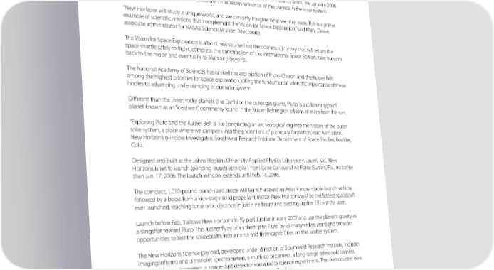 NEW HORIZONS General Release NASA Sets Sights on First Pluto Mission NASA is preparing to launch the first spacecraft to distant Pluto and its moon Charon. The January 2006 launch of New Horizons will complete the initial reconnaissance of the planets in the solar system. “New Horizons will study a unique world, and we can only imagine what we may learn. This is a prime example of scientific missions that complement the Vision for Space Exploration,” said Mary Cleave, associate administrator for NASA’s Science Mission Directorate. The Vision for Space Exploration is a bold new course into the cosmos, a journey that will return the space shuttle safely to flight, complete the construction of the International Space Station, take humans back to the moon and eventually to Mars and beyond. The National Academy of Sciences has ranked the exploration of Pluto-Charon and the Kuiper Belt among the highest priorities for space exploration, citing the fundamental scientific importance of these bodies to advancing understanding of our solar system. Different than the inner, rocky planets (like Earth) or the outer gas giants, Pluto is a different type of planet known as an “ice dwarf,” commonly found in the Kuiper Belt region billions of miles from the sun. “Exploring Pluto and the Kuiper Belt is like conducting an archeological dig into the history of the outer solar system, a place where we can peek into the ancient era of planetary formation,” said Alan Stern, New Horizons principal investigator, Southwest Research Institute Department of Space Studies, Boulder, Colo. Designed and built at the Johns Hopkins University Applied Physics Laboratory, Laurel, Md., New Horizons is set to launch (pending launch approval) from Cape Canaveral Air Force Station, Fla., no earlier than Jan. 17, 2006. The launch window extends until Feb. 14, 2006. The compact, 1,050-pound piano-sized probe will launch aboard an Atlas V expendable launch vehicle, followed by a boost from a kick-stage solid propellant motor. New Horizons will be the fastest spacecraft ever launched, reaching lunar orbit distance in just nine hours and passing Jupiter 13 months later. Launch before Feb. 3 allows New Horizons to fly past Jupiter in early 2007 and use the planet’s gravity as a slingshot toward Pluto. The Jupiter flyby trims the trip to Pluto by as many as five years and provides opportunities to test the spacecraft’s instruments and flyby capabilities on the Jupiter system. The New Horizons science payload, developed under direction of Southwest Research Institute, includes imaging infrared and ultraviolet spectrometers, a multi-color camera, a long-range telescopic camera, two particle spectrometers, a space-dust detector and a radio science experiment. The dust counter was designed and built by students at the University of Colorado, Boulder. Depending on its launch date, New Horizons could reach the Pluto system as early as mid-2015, conducting a five-month-long study possible only from the close-up vantage of a spacecraft. It will characterize the global geology and geomorphology of Pluto and Charon, map their surface 2 NASA’s First Mission to Pluto and the Kuiper Belt