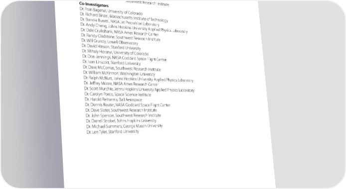 NEW HORIZONS The New Horizons Science Team Principal Investigator: Dr. Alan Stern, Southwest Research Institute Project Scientist: Dr. Hal Weaver, Johns Hopkins University Applied Physics Laboratory Deputy Project Scientist: Dr. Leslie Young, Southwest Research Institute Co-Investigators Dr. Fran Bagenal, University of Colorado Dr. Richard Binzel, Massachusetts Institute of Technology Dr. Bonnie Buratti, NASA Jet Propulsion Laboratory Dr. Andy Cheng, Johns Hopkins University Applied Physics Laboratory Dr. Dale Cruikshank, NASA Ames Research Center Dr. Randy Gladstone, Southwest Research Institute Dr. Will Grundy, Lowell Observatory Dr. David Hinson, Stanford University Dr. Mihaly Horanyi, University of Colorado Dr. Don Jennings, NASA Goddard Space Flight Center Dr. Ivan Linscott, Stanford University Dr. Dave McComas, Southwest Research Institute Dr. William McKinnon, Washington University Dr. Ralph McNutt, Johns Hopkins University Applied Physics Laboratory Dr. Jeffrey Moore, NASA Ames Research Center Dr. Scott Murchie, Johns Hopkins University Applied Physics Laboratory Dr. Carolyn Porco, Space Science Institute Dr. Harold Reitsema, Ball Aerospace Dr. Dennis Reuter, NASA Goddard Space Flight Center Dr. Dave Slater, Southwest Research Institute Dr. John Spencer, Southwest Research Institute Dr. Darrell Strobel, Johns Hopkins University Dr. Michael Summers, George Mason University Dr. Len Tyler, Stanford University 14 NASA’s First Mission to Pluto and the Kuiper Belt